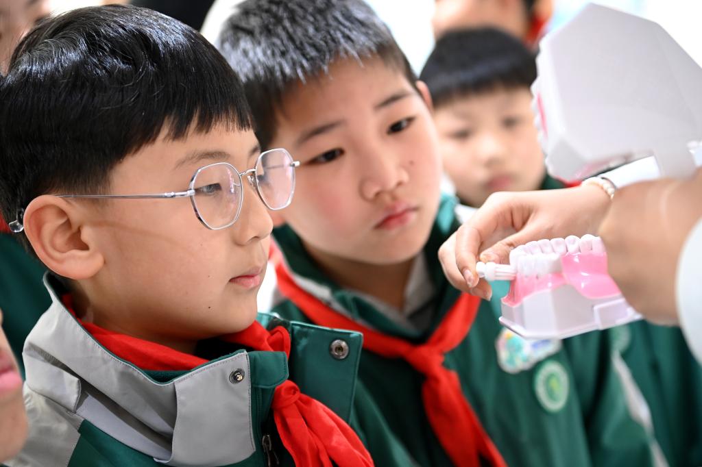 3月20日,陕西省西安市新城区通济坊小学的学生在西安交通大学口腔医院口腔科普教育基地学习正确的刷牙方法。新华社记者 李一博 摄