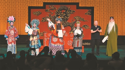 京剧《红鬃烈马》演员谢幕(左起)常秋月、谭茗心、谭筱羽、谭小令、韩巨明、刘孟千一。