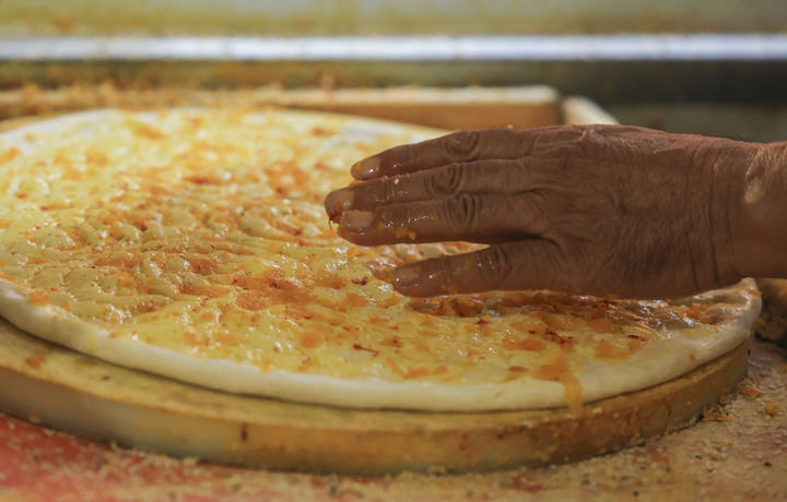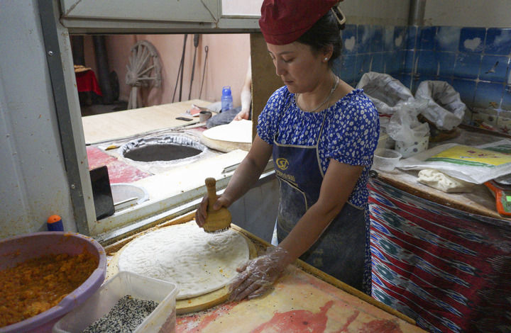 在新疆库车市,热西提在往馕胚上撒放香料(7月22日摄)。新华社记者王菲摄