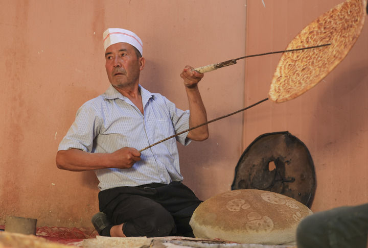 今年65岁的热西提是传统面食制作技艺(馕制作技艺)国家级非遗代表性传承人,他从18岁起,便和父亲学习打馕技艺,从祖辈手中继承下来的绝活儿,如今又传授给了儿子。每天光顾热西提馕店的顾客络绎不绝,有当地百姓,也有慕名而来的四海游客。一天下来,热西提和儿子及徒弟打出的一两千张库车大馕,全都销售一空。
