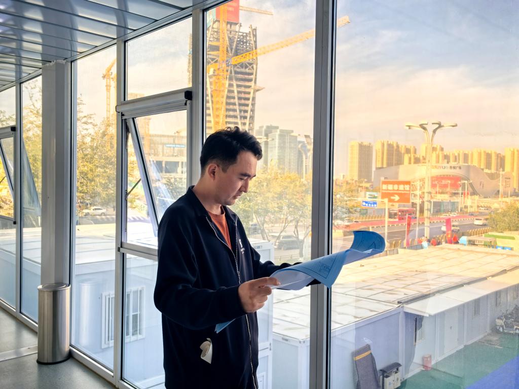 9月23日,结构工程师阿合特列克·夏利哈尔在乌鲁木齐华美胜地丽思卡尔顿酒店集群及商旅综合体项目施工现场核对细部做法。新华社记者 王泽宇 摄