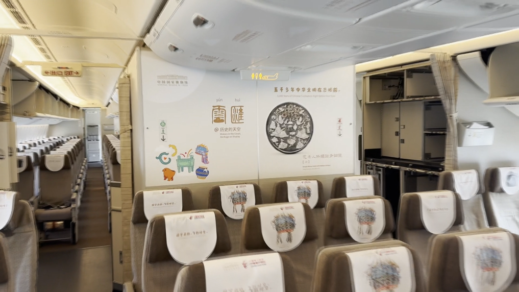 “国博号” 主题彩绘飞机为B777-300ER大型宽体客机,机号B-7882。其外观采用双面全机身童趣彩绘,玉龙、玉凤、鹰形陶鼎等从国博143万余件馆藏中精选出的6件珍藏,在小朋友们的画笔下“飞”上机身。在机舱内,行李架、小桌板、头枕巾、机载屏幕等均成为文化展示空间,近50件国博馆藏精品文物形象与故事陪伴乘客旅途。
