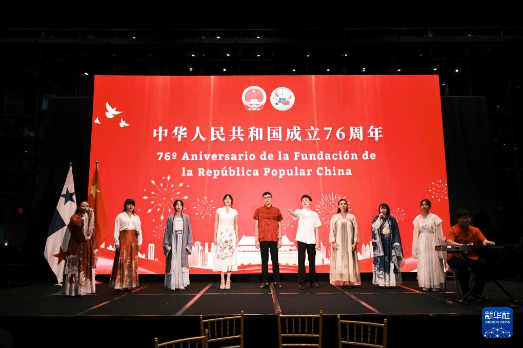 9月22日,在巴拿马首都巴拿马城,当地青年在庆祝中华人民共和国成立76周年招待会上合唱中文歌曲。新华社记者 许咏政 摄