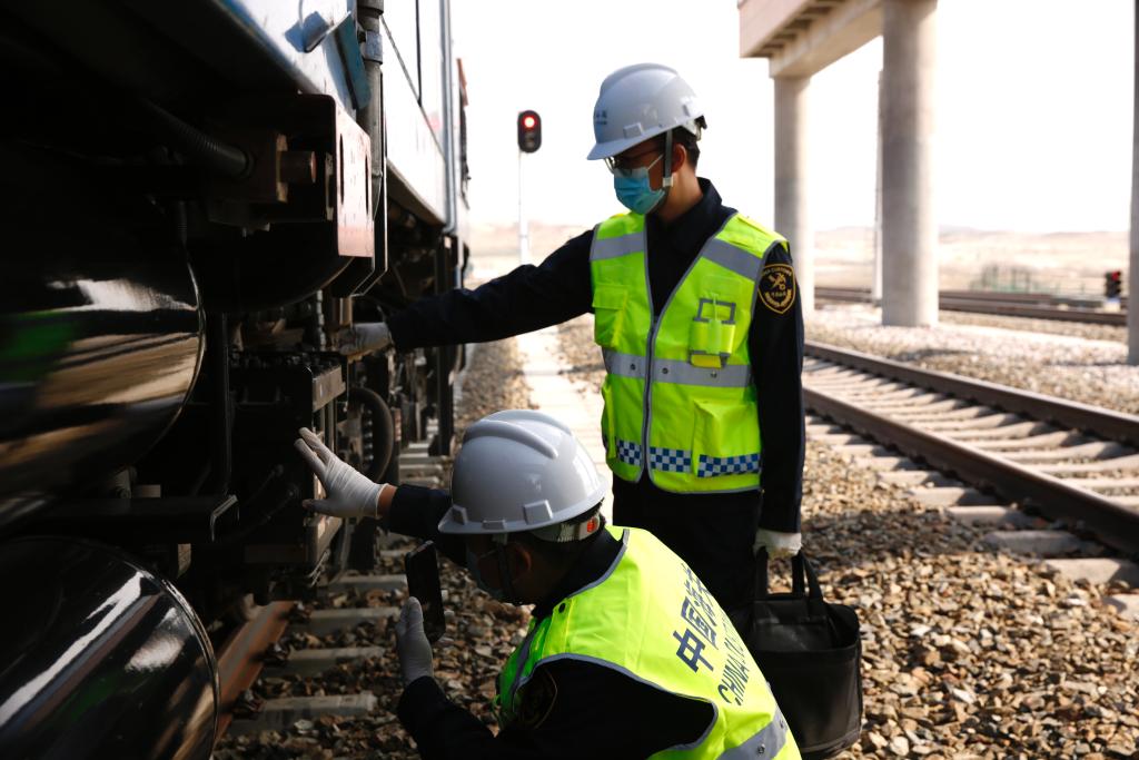 海关关员对入境中欧班列车体进行检查。(受访单位供图)