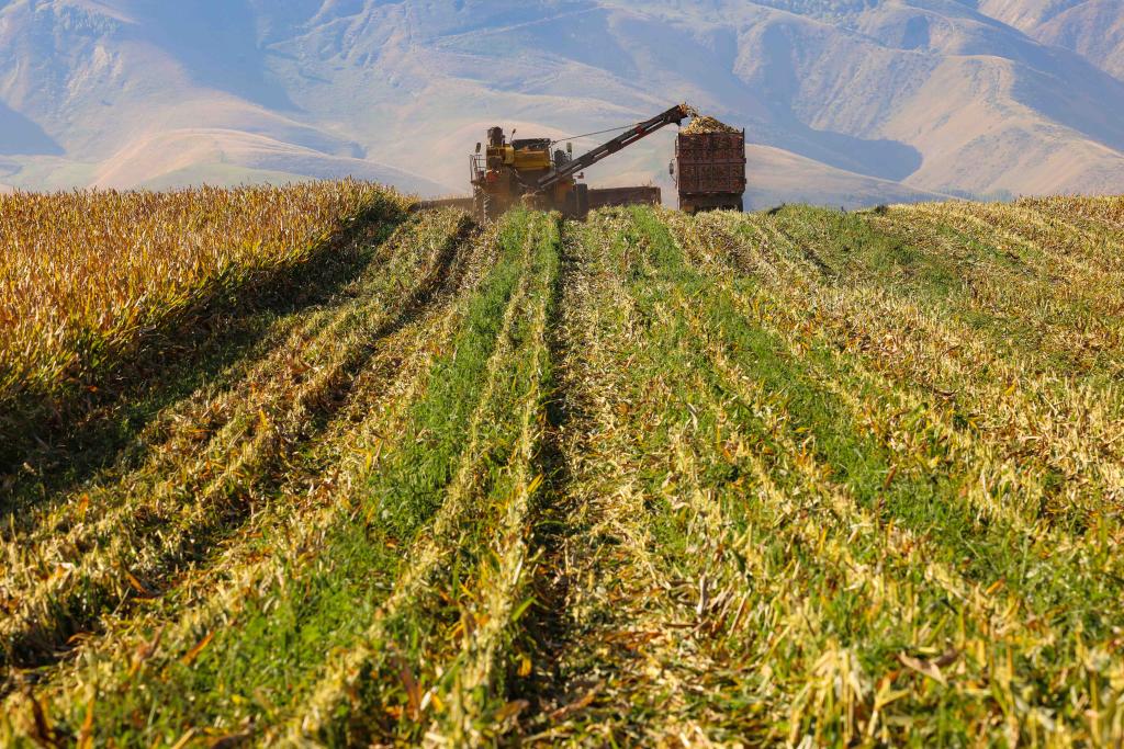 在新疆伊犁哈萨克自治州一处农田里,收割机在采收玉米。(受访单位供图)