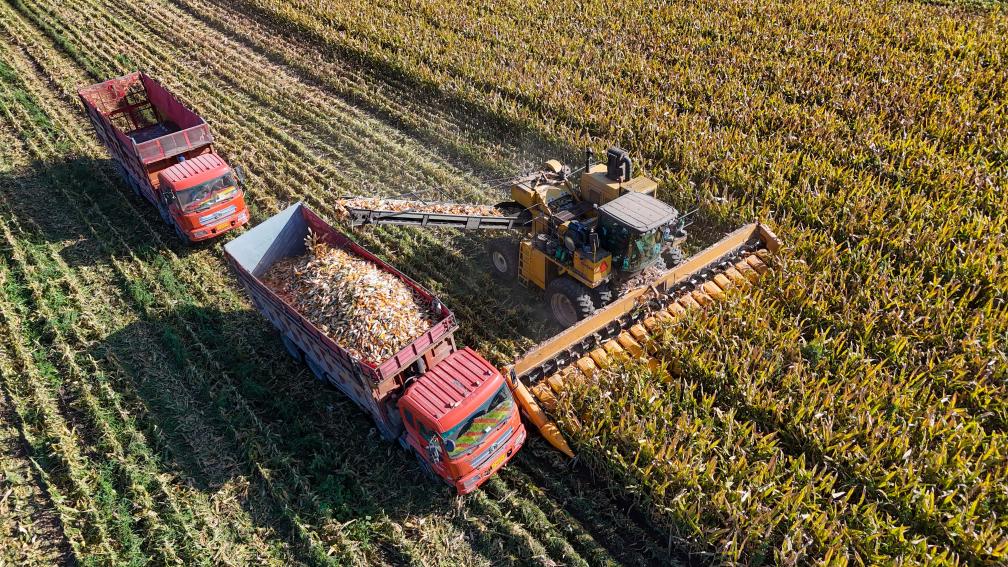 在新疆伊犁哈萨克自治州新源县的农田里,收割机在采收玉米。(受访单位供图)