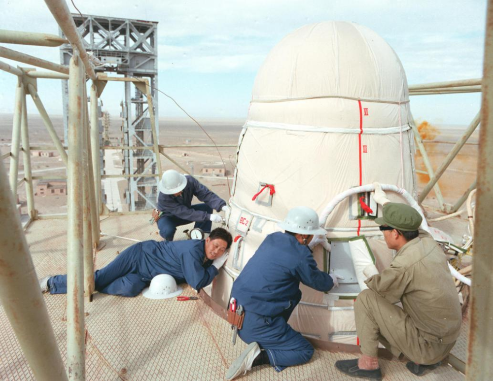科技人员在卫星发射塔上,对即将发射上天的返回式技术探测卫星进行最后的检测和处理。新华社记者 邹毅 摄(1991年5月28日发)