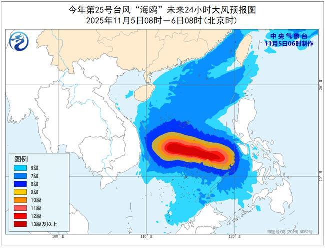 大风预报:5日08时至6日08时,受“海鸥”和南下冷空气的共同影响,台湾海峡、台湾以东洋面、巴士海峡、南海大部及东沙群岛、南沙群岛、中沙群岛、西沙群岛、黄岩岛将有6-8级大风、阵风9-10级,其中南海中部和南部的部分海域、南沙群岛北部将有9-11级大风、阵风12-13级,“海鸥”中心经过的附近海域风力有12-14级、阵风15-16级。