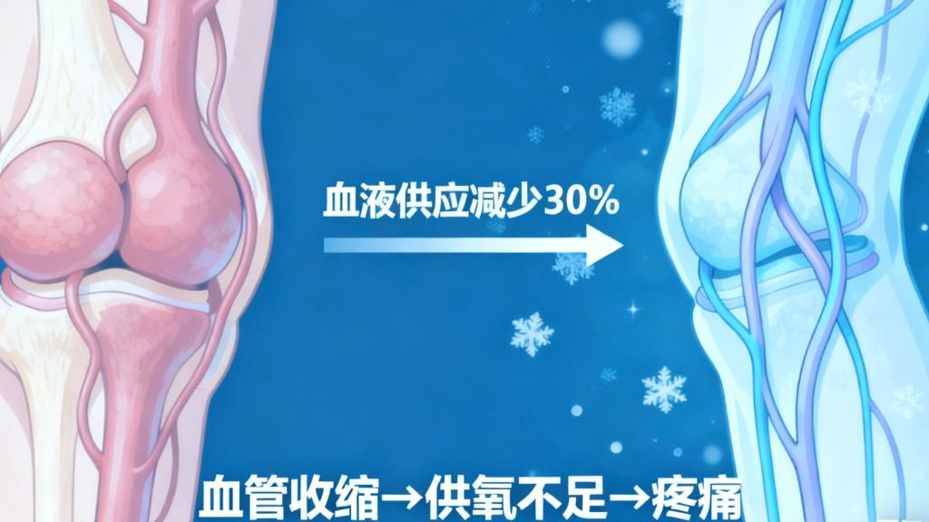 血管收缩,关节“营养通道”被堵。当气温降低时,膝关节周围的小血管会自动收缩,让关节的血液供应减少30%以上,造成局部供血、供氧不足,产生疼痛。