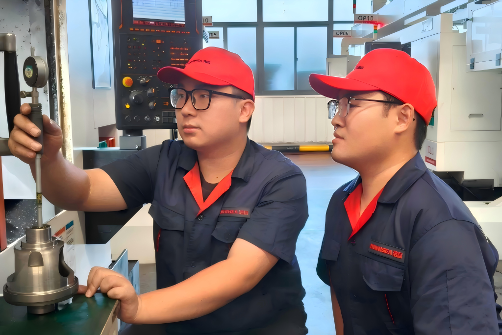潍坊浩泰机械有限责任公司车间班长为“订单班”学生讲解关键部件的装配规范。(陈国栋 摄)