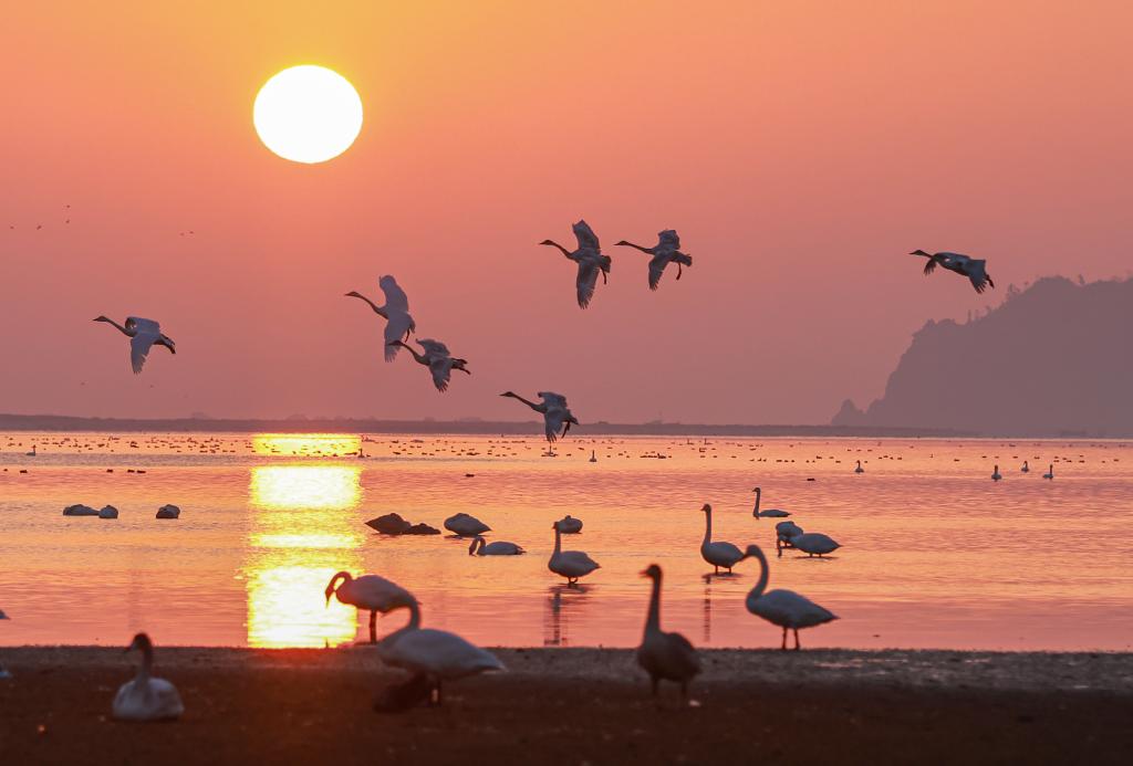冬日清晨,在山东省荣成市成山镇天鹅湖,大天鹅在晨曦中游弋、漫步、觅食,构成一幅和谐的生态画卷。新华社发(李信君 摄)