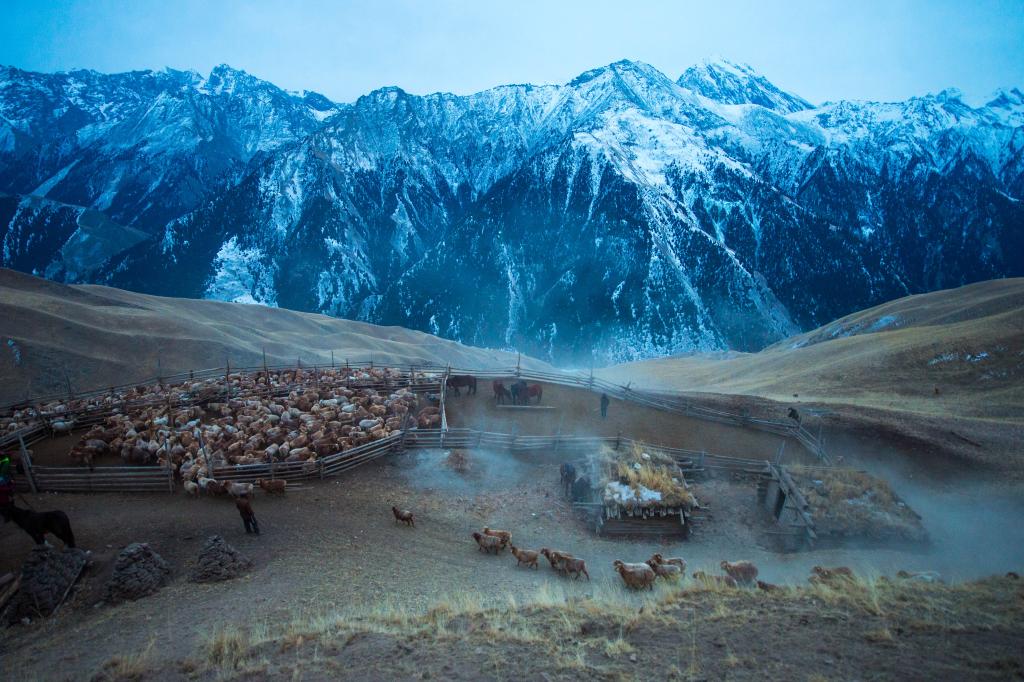 冬日傍晚,新疆伊犁包扎得尔的一个冬牧场,哈萨克族牧民的羊群归圈。牧民在冬牧场连续生活5个月,待到来年3月再次转出,人们把这种季节性迁徙称为“转场”。千百年来,这一习俗在当地绵延流传,直到今天。 新华社记者 江文耀 摄