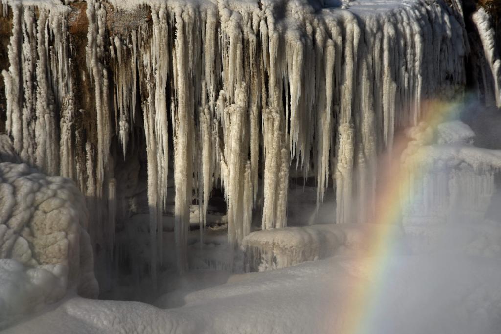 冬日在黄河壶口瀑布景区出现的“冰瀑飞虹”景观。新华社发(吕桂明摄)