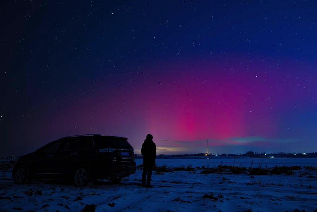 在位于黑龙江省黑河市的北大荒集团北安分公司长水河农场有限公司,摄影爱好者在观看绚丽极光。新华社发(钱泊羽 摄)