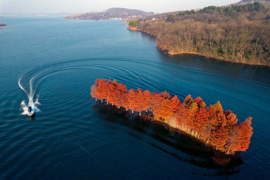 冬日时节,江苏省盱眙县天泉湖“水上森林”色彩斑斓,美如画卷。 新华社发(汤德宏 摄)