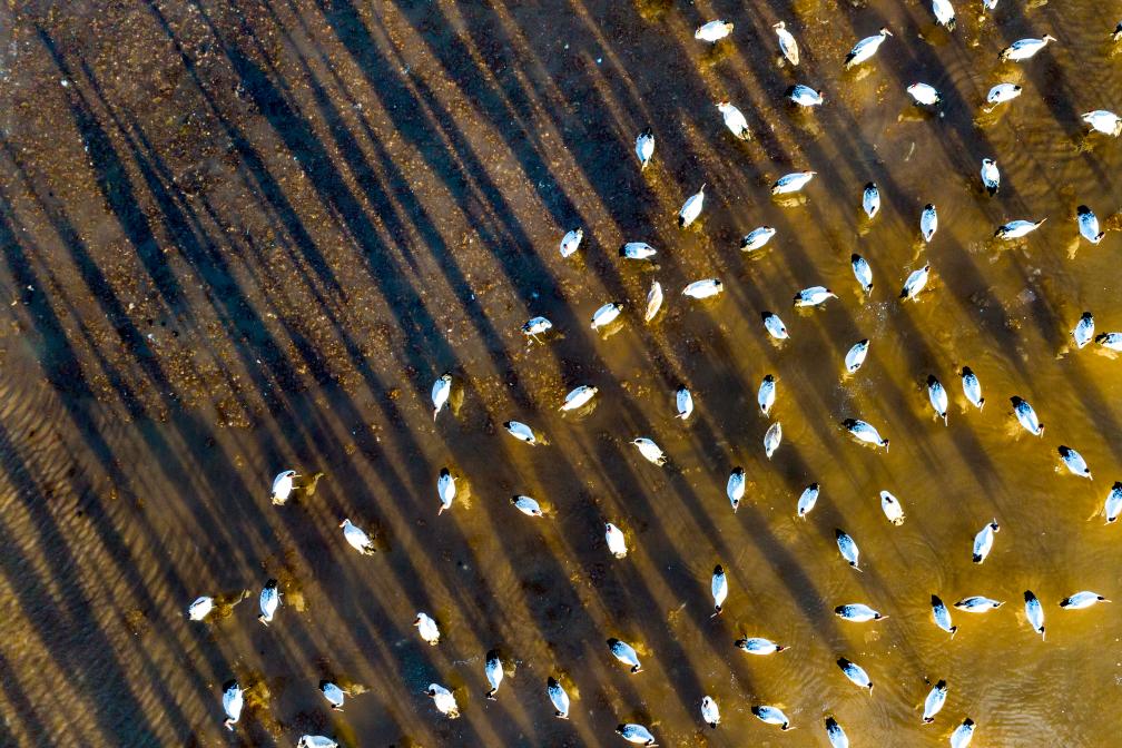 冬日里,在位于江西省南昌市高新区的白鹤小镇,数千只白鹤等候鸟在白鹤保护小区的藕塘里嬉戏觅食。它们时而追逐打闹,时而振翅飞翔,享受着鄱阳湖畔的冬日暖阳。新华社记者 万象 摄