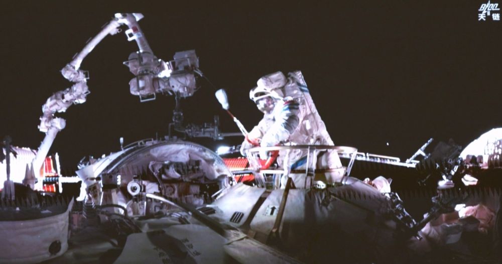 ↑这是5月22日在北京航天飞行控制中心屏幕上拍摄的神舟二十号航天员陈冬出舱的画面(视频截图)。新华社记者厉彦辰 摄