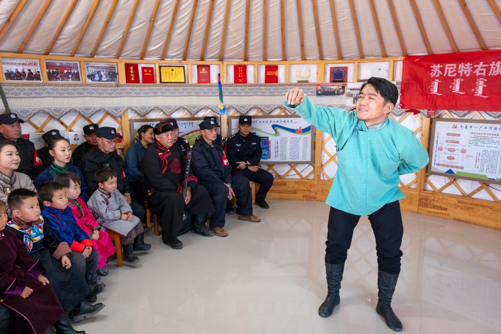11月12日,在内蒙古锡林郭勒盟苏尼特右旗额仁淖尔苏木吉呼郎图嘎查,乌兰牧骑的退役演员在演出前开展学习贯彻党的二十届四中全会精神宣讲活动。