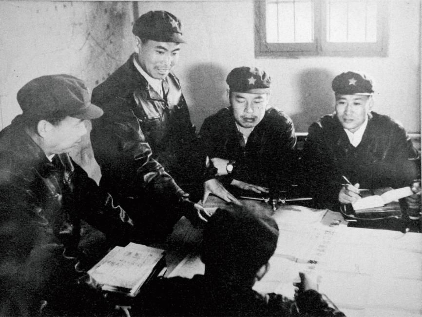 1974年海洋航空磁测,吴玉恒机组制定计划(左2为吴玉恒)。