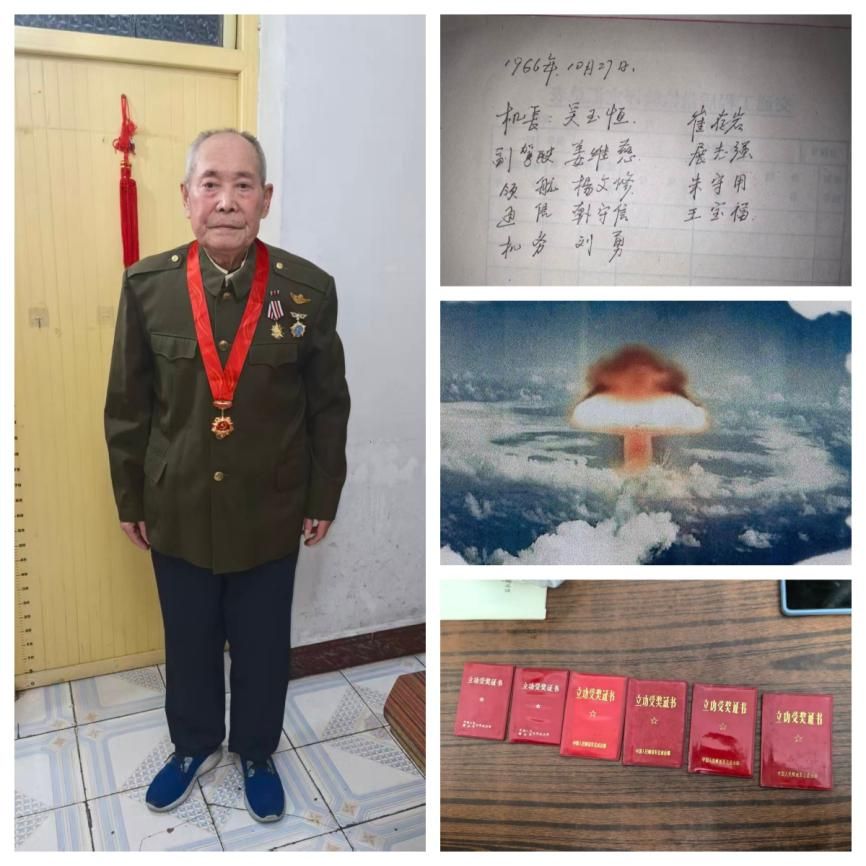 图1为吴玉恒荣获“光荣在党50年”纪念章时的照片;图2为1966年10月27日,吴玉恒在飞行日记上写下的穿越蘑菇云的两个机组人员名单;图3为核弹爆炸时的情景;图4为吴玉恒的立功证书。