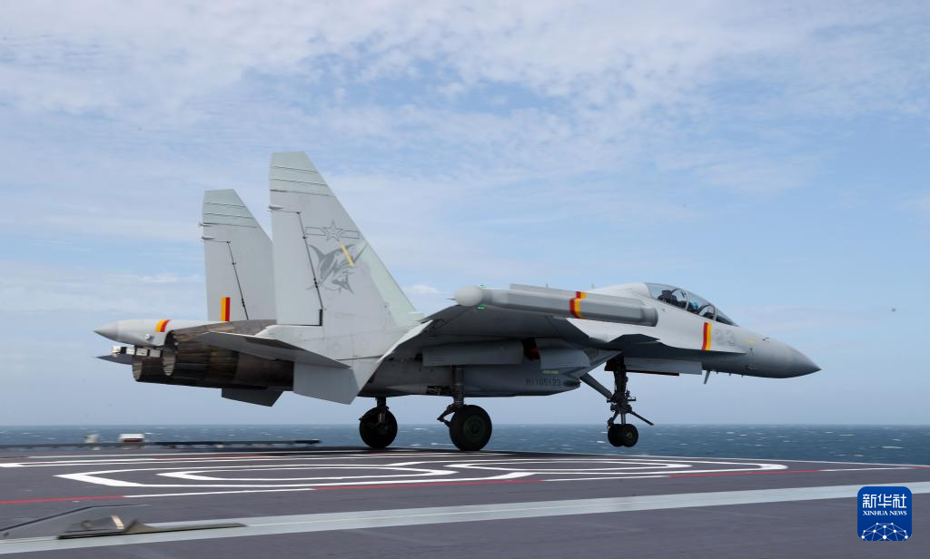 日前,海军福建舰开展入列后首次海上实兵训练。这是歼-15DT舰载机着舰。新华社发(姜超 摄)