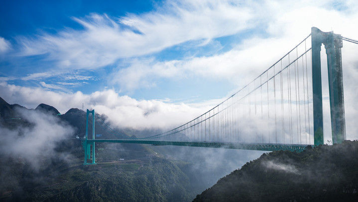 2025年9月28日,世界第一高桥——贵州花江峡谷大桥建成通车。花江峡谷大桥是贵州六枝至安龙高速公路的控制性工程,大桥全长2890米,主跨径1420米,是目前世界山区峡谷第一大跨度钢桁梁悬索桥;其桥面距水面垂直高度625米,是新的世界第一高桥。