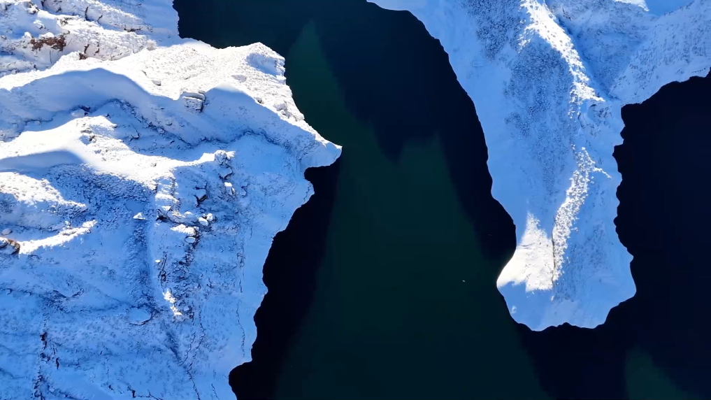赭红山岩与皑皑白雪相映成趣,赤壁天湖静卧其间如碧玉点缀。百丈崖壁层叠错落,丹霞峰林形态各异、险峻壮美。