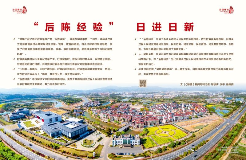 ◇“‘后陈经验’开启了浙江全过程人民民主的全新探索。依托村监委会等机制,促进全过程人民民主贯通民主选举、民主协商、民主决策、民主管理、民主监督各环节、全链条,为提升基层治理水平提供了重要支撑。”