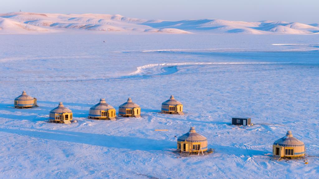 这是近日在内蒙古呼伦贝尔市陈巴尔虎旗拍摄的雪原上的蒙古包(无人机照片)。冬日里,呼伦贝尔大草原银装素裹。在内蒙古自治区呼伦贝尔市陈巴尔虎旗境内,莫尔格勒河蜿蜒曲折穿过雪原,蒙古包点缀其间,构成一幅宁静壮美的北国冬日画卷。新华社记者 马金瑞 摄