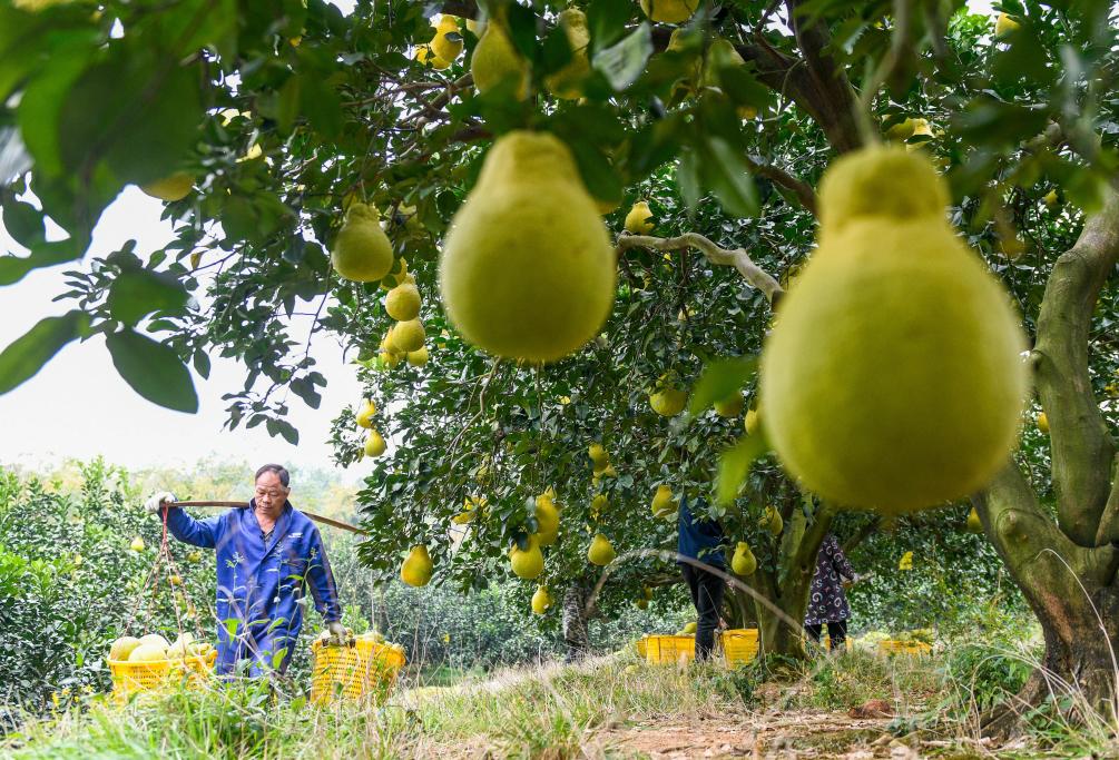 12月6日,在湖南省永州市道县梅花镇赤源村三和希望农场,农民在收获柚子。大雪节气到来之际,各地农民抢抓农时开展农业生产。新华社发(蒋克青摄)