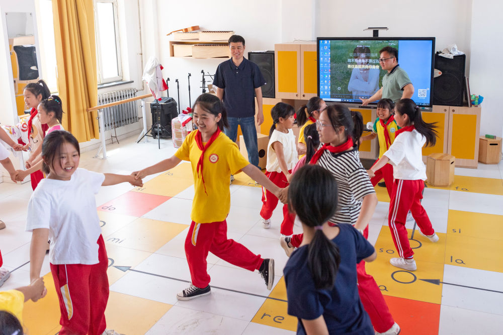 2025年5月30日,在黑龙江省安达市任民镇中心学校,音乐教师李平(后左)和张雨(后右)指导孩子们跳舞。该校学生中留守儿童较多,为丰富学生们的课余生活,2019年初,李平和张雨成立“村里的孩儿”音乐班,在保障孩子们正常文化课学习的基础上,利用午休和社团活动课的时间,教给他们合唱技巧和乐器演奏等音乐知识。如今,“村里的孩儿”音乐班已有5批孩子毕业,不少孩子走出农村去往全国各地演出。