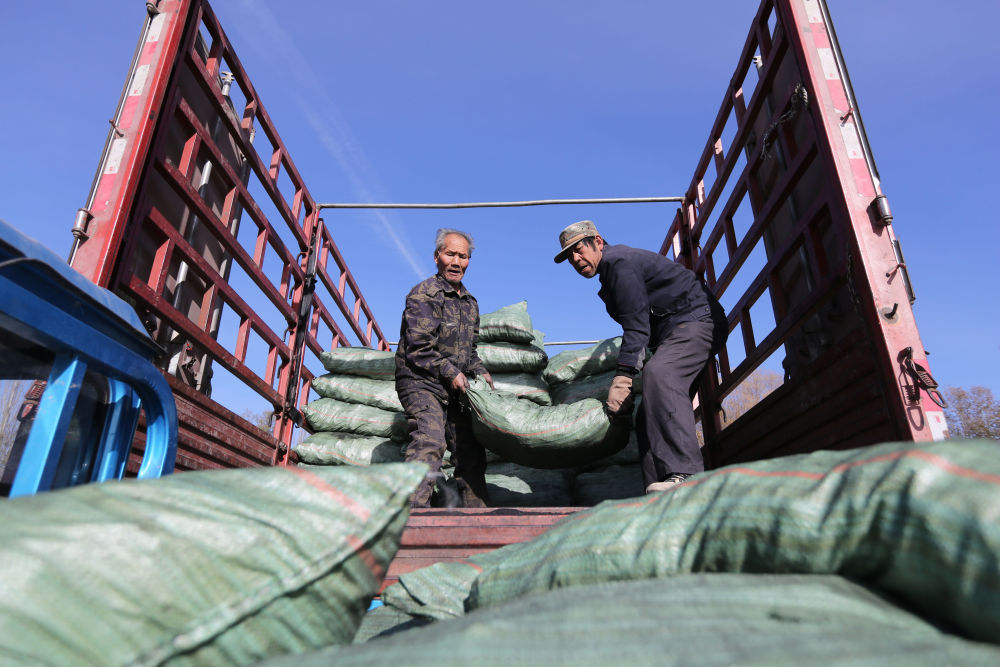 2025年11月19日,甘肃省定西市安定区内官营镇先锋村村民在搬运政府发放的取暖用煤。初冬时节,甘肃省定西市开展“问暖”“送暖”“助暖”活动,为农村分散供养特困人员发放取暖用煤、燃煤炉、电热毯、棉衣棉被等,开展救助帮扶,保障困难群众温暖过冬。