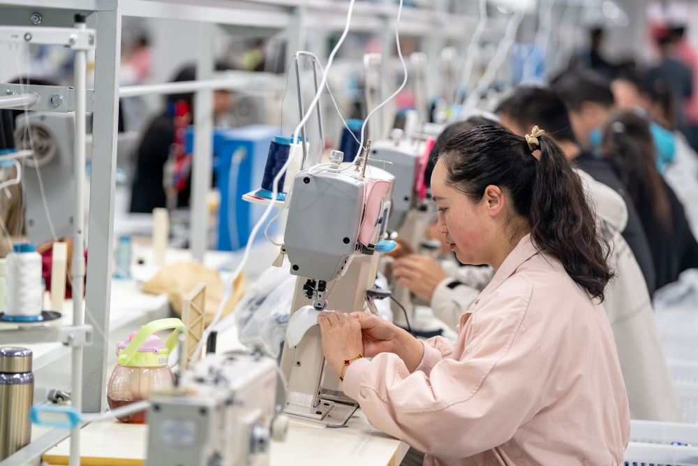 2025年5月13日,云南省昭通市镇雄县居民在镇雄纺织服装产业园鞋服加工车间工作。近年来,地处乌蒙山腹地的镇雄县将“家门口的务工车间”建设作为改善民生福祉的重要举措,通过搭建“园区+工坊”平台、发展劳动密集型企业、畅通就业渠道等方式,多措并举促进群众在“家门口就业”。