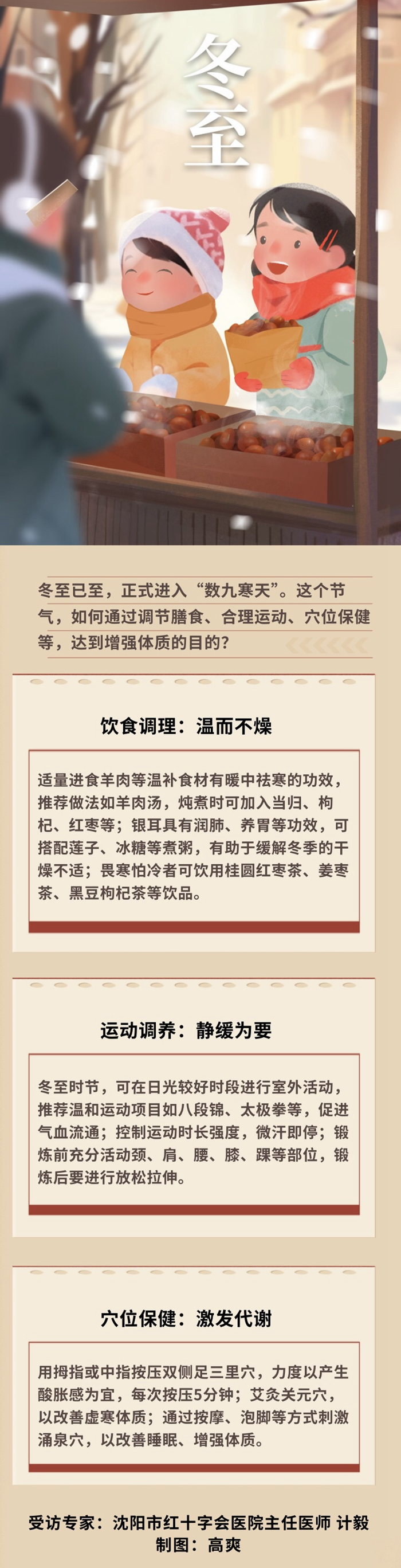 12月21日是冬至节气。这个节气,如何通过调节膳食、合理运动、穴位保健等,达到增强体质的目的?让我们通过海报,了解一下冬至时节的养生知识。