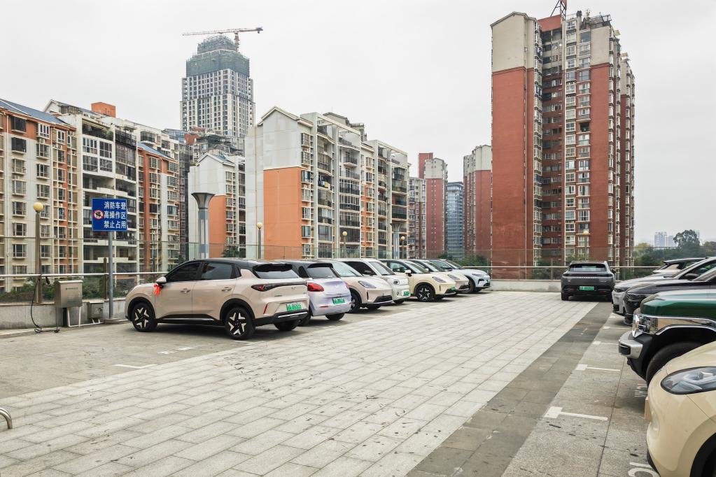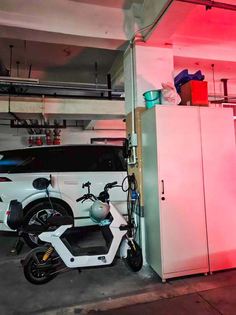 在四川某市一小区,业主在车位旁“飞线”充电,旁边私设的储物柜上放置了可燃物(12月5日摄)。