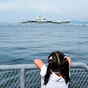 7月3日,中国海军山东舰航母编队抵达香港,一名儿童在岸上观看海军山东舰。