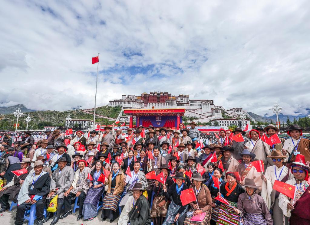 8月21日,西藏各族各界干部群众约2万人欢聚拉萨市布达拉宫广场,热烈庆祝西藏自治区成立60周年。这是群众在庆祝大会现场合影。