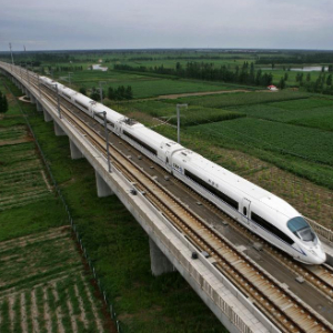 ↑2008年8月1日,动车组列车飞驰在京津城际高速铁路天津杨村特大桥上。当日,北京至天津的城际高速铁路正式开通运营。新华社发(原瑞伦摄)