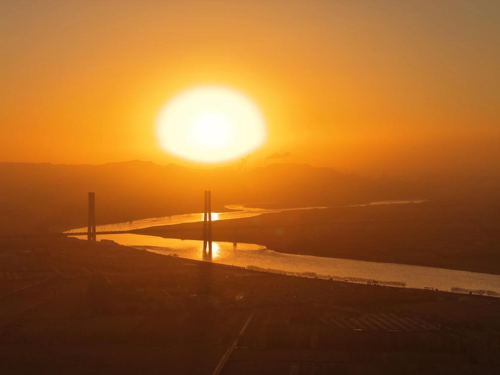 ↑这是2025年12月23日在日出时分拍摄的包银高铁乌海黄河特大桥。新华社记者 邢广利 摄