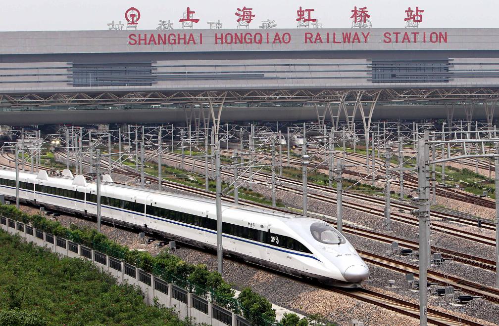 ↑2011年6月30日,一辆CRH380型高速列车从上海虹桥站驶出。当日,京沪高铁正式开通运营。新华社记者 凡军 摄