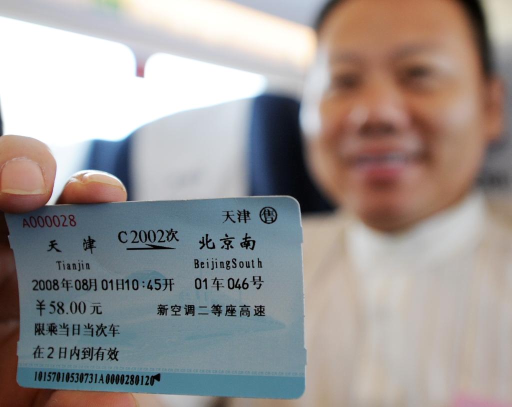 ↑2008年8月1日,一名姓谢的南京乘客在天津开往北京的京津城际列车上展示当日当次车票。当日,北京至天津的城际高速铁路正式开通运营。新华社记者 王晔彪 摄