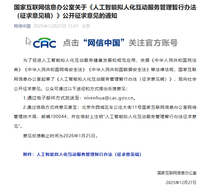 原标题:国家互联网信息办公室关于《人工智能拟人化互动服务管理暂行办法(征求意见稿)》公开征求意见的通知
