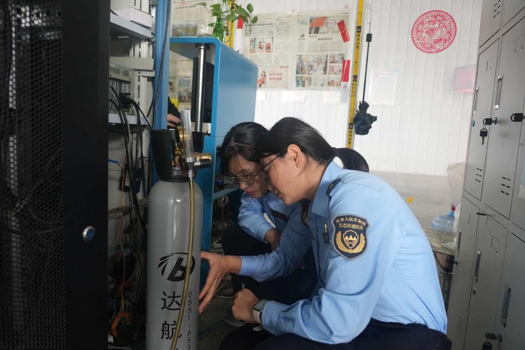 2025年10月,安徽省生态环境执法人员在一家机动车检测站对设备进行检查。新华社发 刘宇 摄