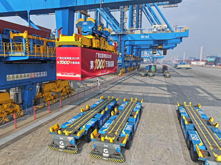 12月30日,北部湾港迎来又一里程碑式时刻:集装箱年吞吐量突破1000万标箱,集装箱航线总数达100条;2025年西部陆海新通道铁海联运班列累计开行超万列,北部湾港铁海联运集装箱运量突破50万标箱。