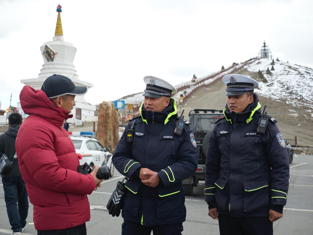 “‘二台子’那个弯道背阴,冰还没化,要把警车开到路上去提醒。‘老2885’弯急,要多注意。‘小坝子’要守两个人,提醒车子一定不能占道停在路上!”四郎多吉在对讲机里“排兵布阵”。
