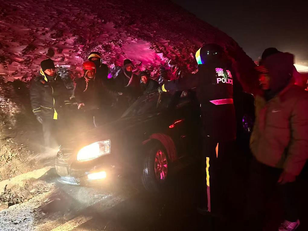 折多山警务站民辅警帮助侧翻的私家车脱困。(甘孜公安供图)