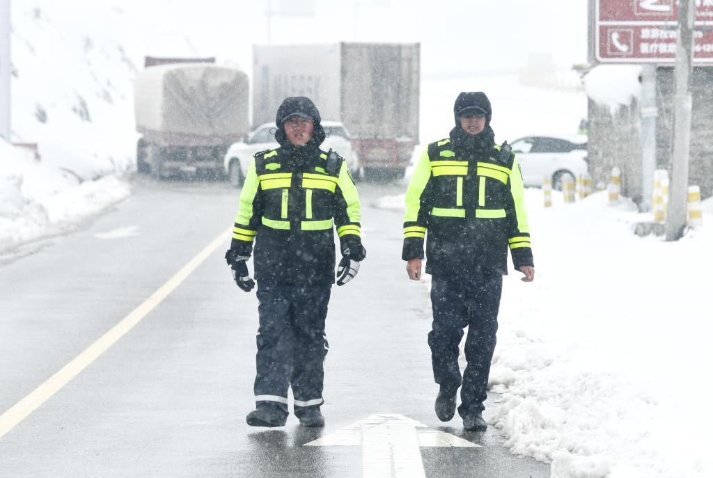 包永鹏(左)与王洛让(右)在堵点执勤。(甘孜公安供图)
