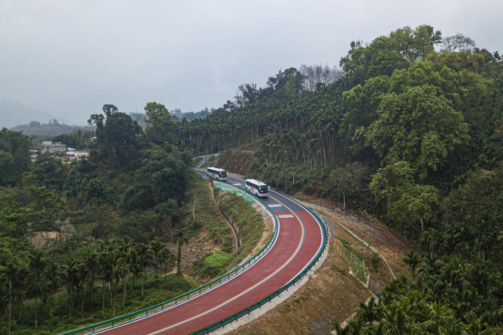 2025年2月21日,观光巴士行驶在海南环热带雨林国家公园旅游公路琼中段(无人机照片)。新华社记者 蒲晓旭 摄