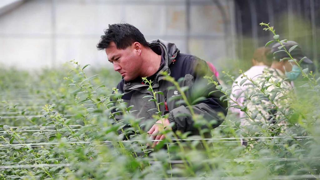 1月8日,在甘肃省定西市安定区鲁家沟镇的设施蔬菜大棚中,一名技术人员在查看蓝莓生长状况。新华社记者 郭刚 摄