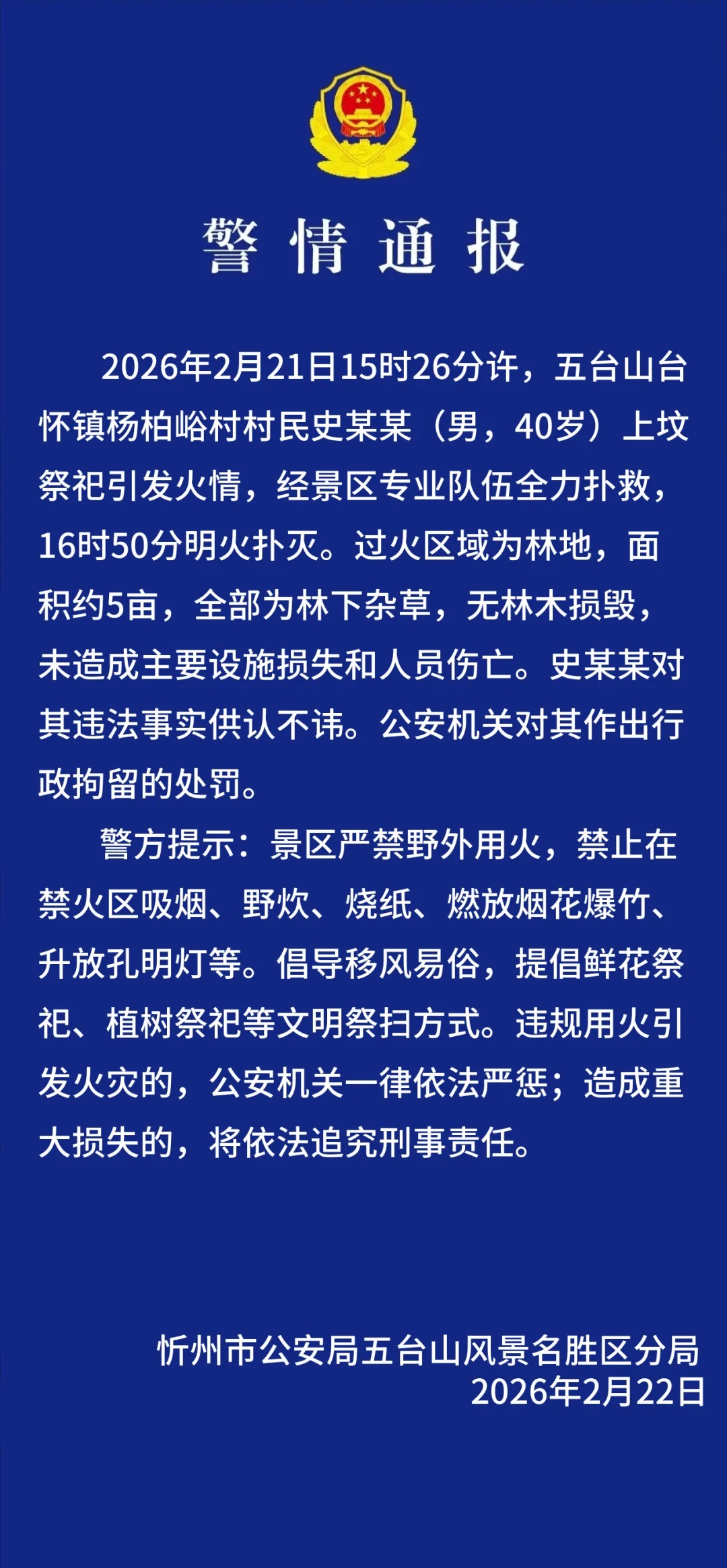 2026年2月21日15时26分许,五台山台怀镇杨柏峪村村民史某某(男,40岁)上坟祭祀引发火情,经景区专业队伍全力扑救,16时50分明火扑灭。过火区域为林地,面积约5亩,全部为林下杂草,无林木损毁,未造成主要设施损失和人员伤亡。史某某对其违法事实供认不讳。公安机关对其作出行政拘留的处罚。